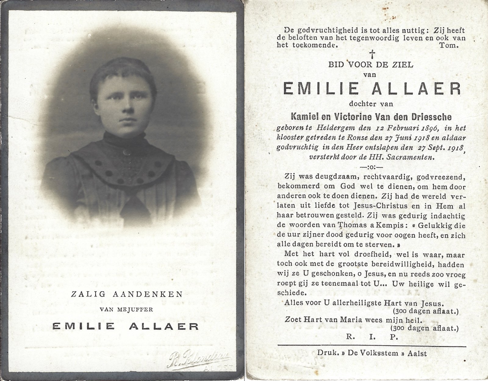 | Allaer Emilie, Zuster Emilie | Heldergem | 12/02/1896 | Ronse | 27/09/1918 |