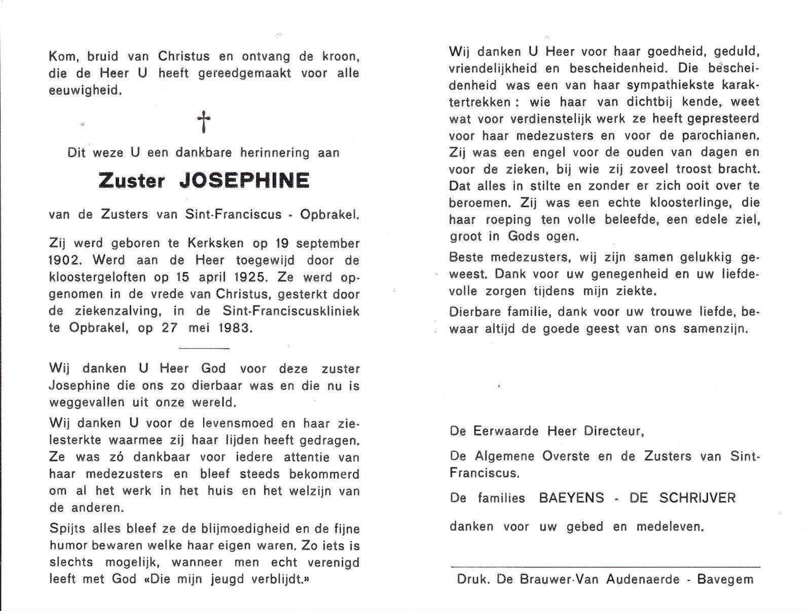 | Baeyens Josephine, Zuster Josephine | Kerksken | 19/09/1902 | Opbrakel | 27/05/1983 |