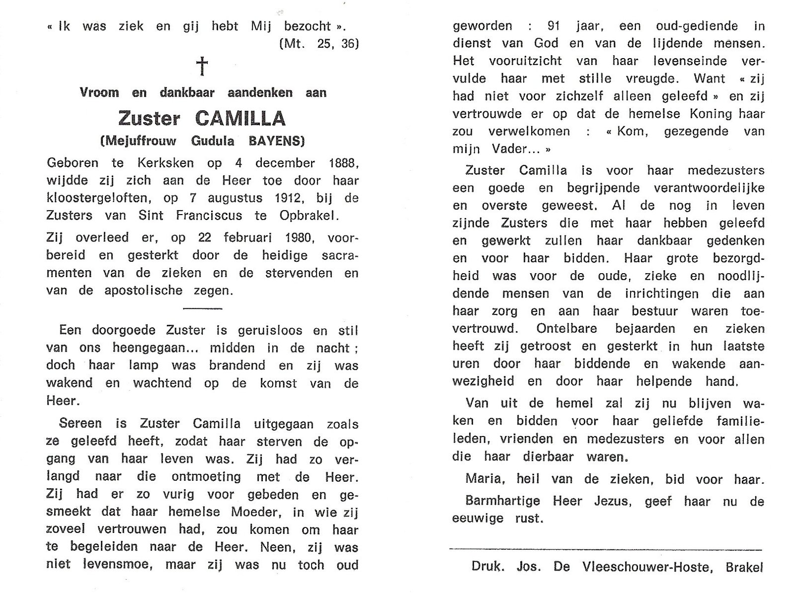 | Bayens Gudula, Zuster Camilla | Kerksken | 04/12/1888 | Opbrakel | 22/02/1980 |