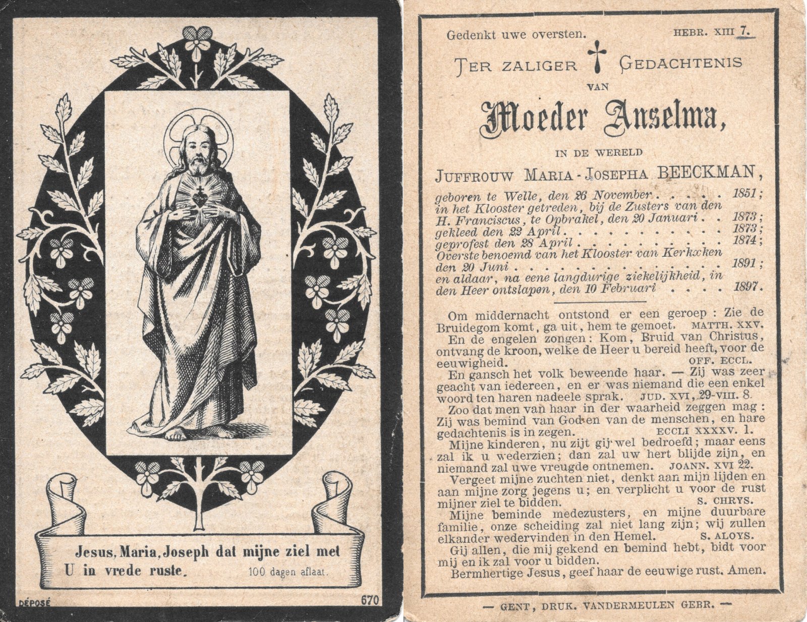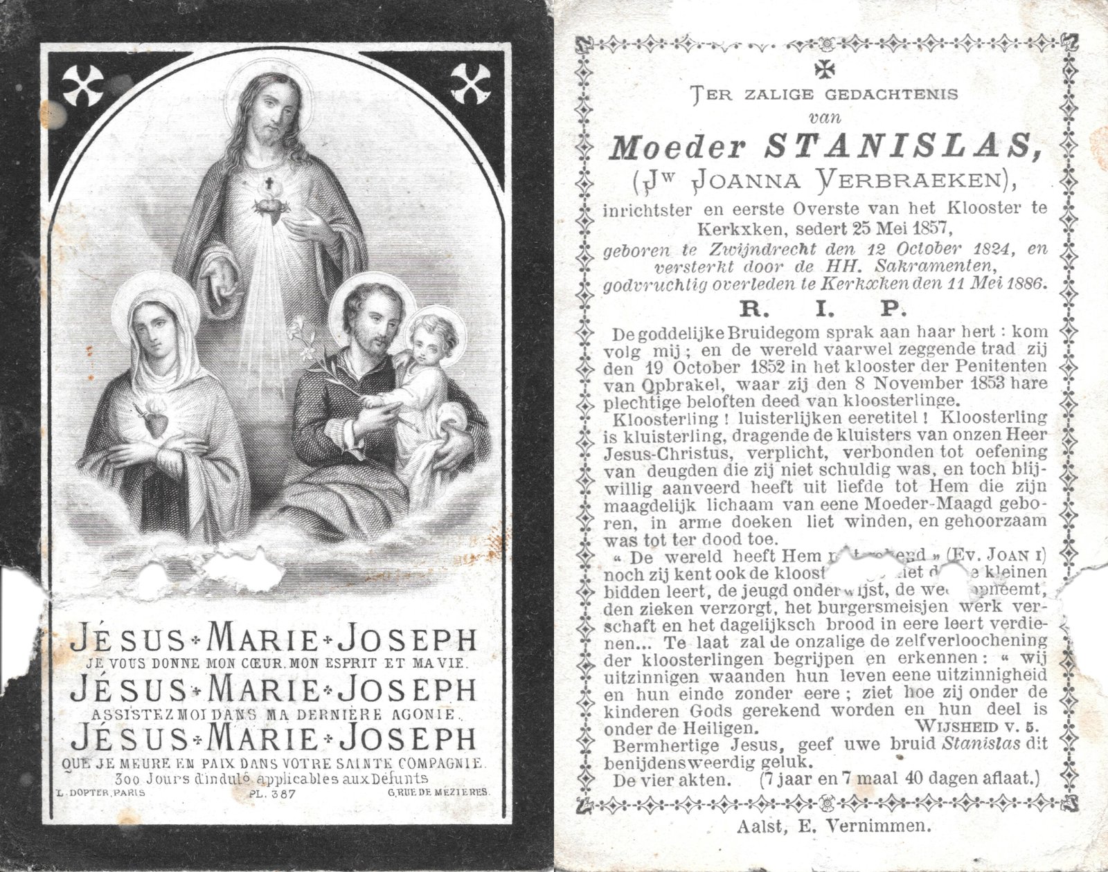 | Verbraeken Joanna, Moeder Stansislas | Zwijndrecht | 25/05/1857 | Kerksken | 11/05/1886 |