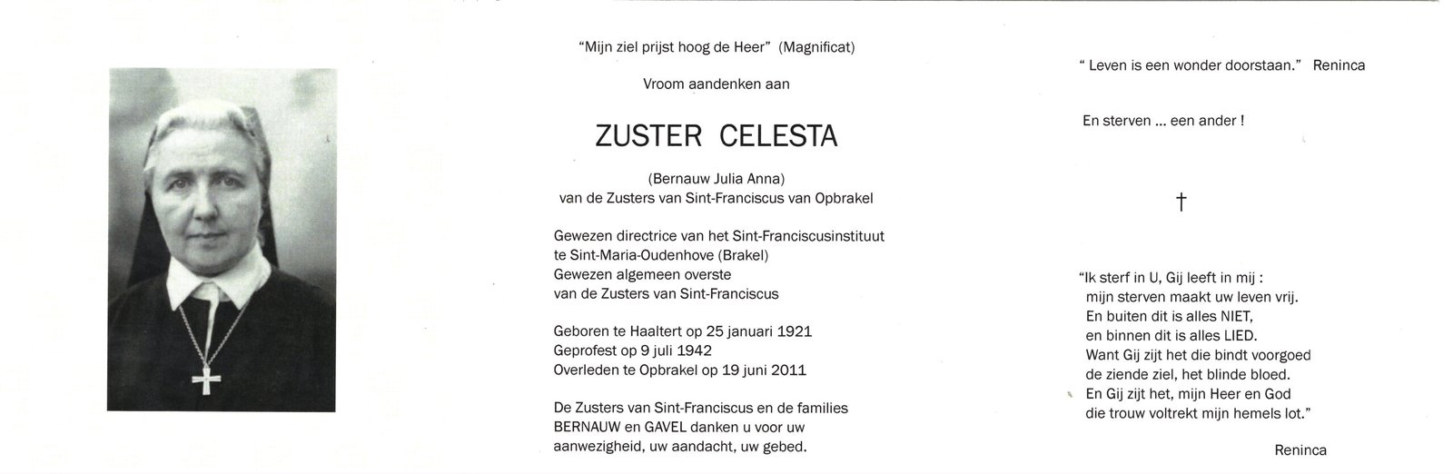 | Bernauw Julia, Zuster Celeste | Haaltert | 25/01/1921 | Opbrakel | 19/06/2011 |