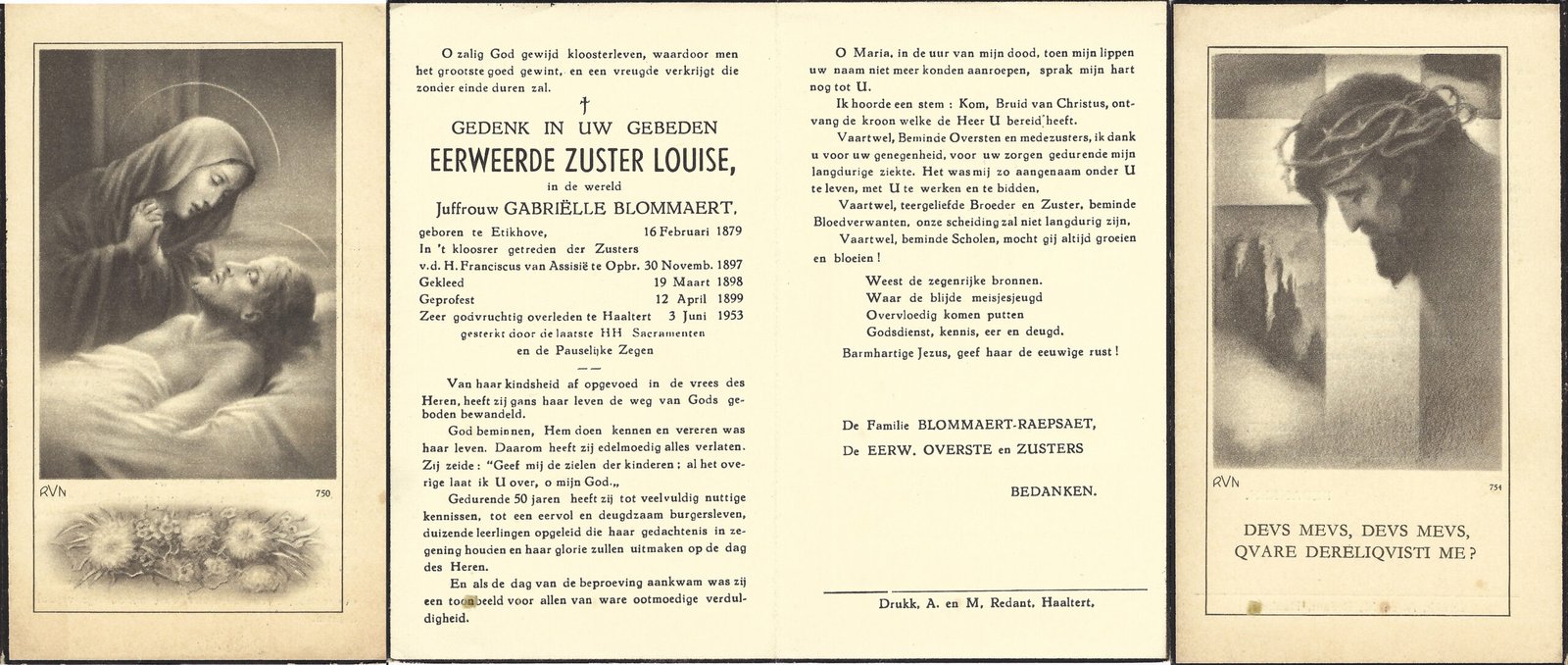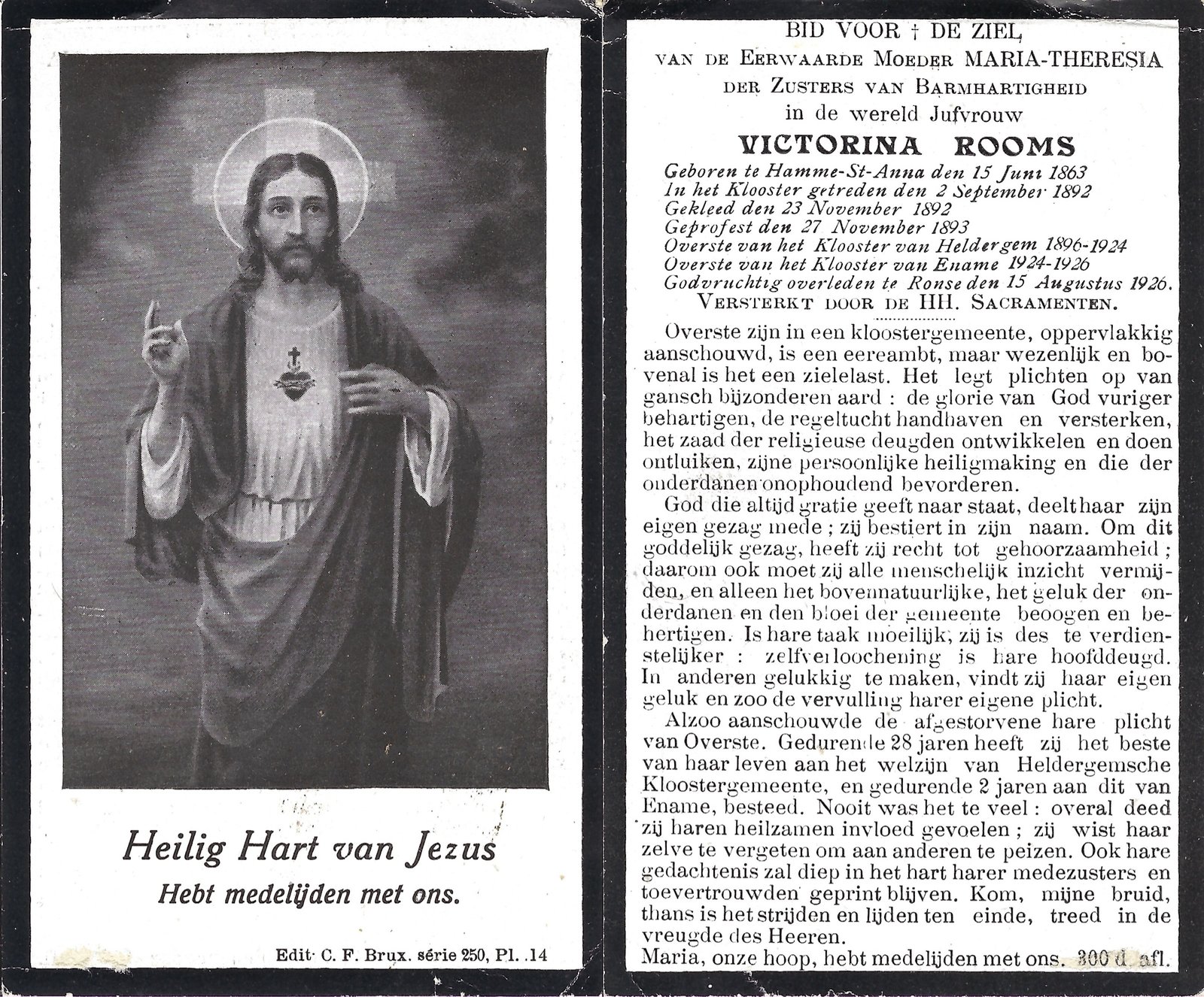 | Rooms Victorina, Moeder Maria-Thérèsia | Hamme | 15/06/1863 | Ronse | 15/08/1926 |