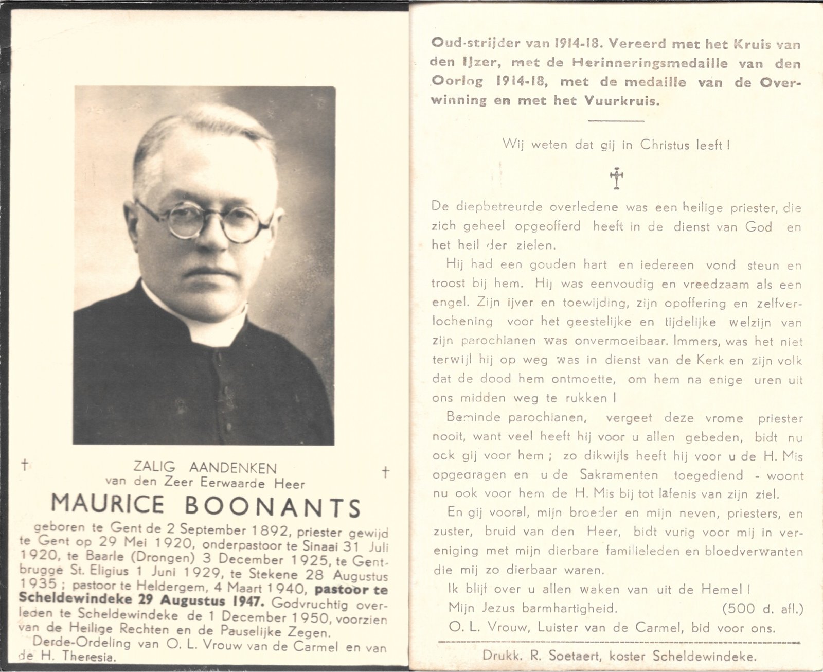| Boonants Maurice, Priester Heldergem | Gent | 02/09/1892 | Scheldewindeke | 01/12/1950 |