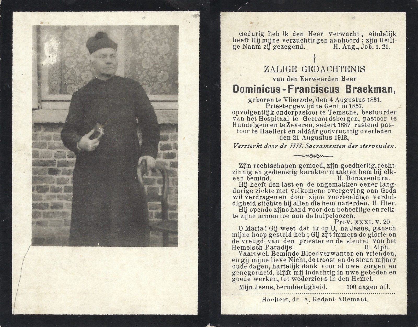 | Braekman Dominicus, Priester Haaltert | Vlierzele | 04/08/1831 | Haaltert | 21/08/1913 |