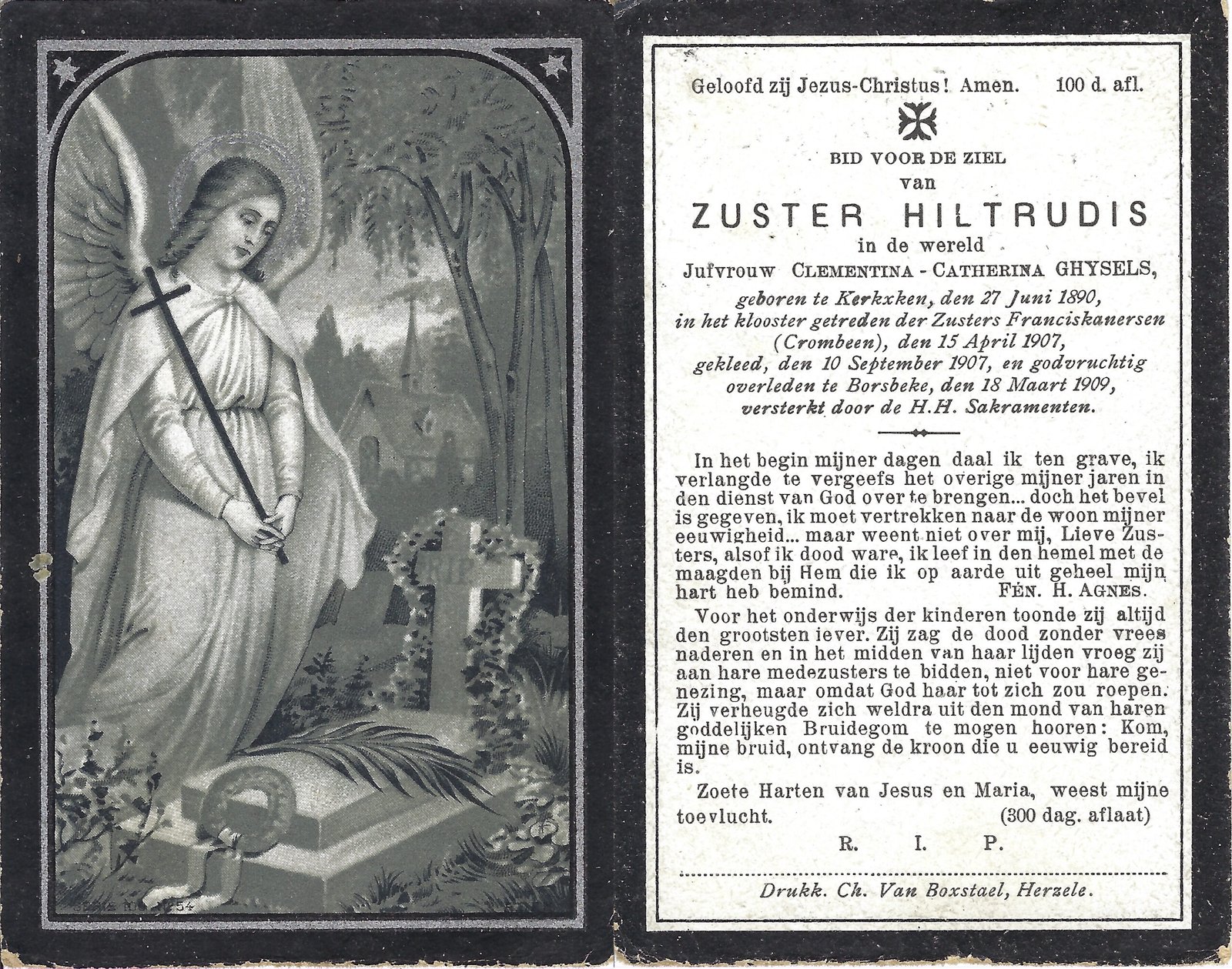 | Ghysels Clementina-Catherina, Zuster Hiltrudis | Kerksken | 27/06/1890 | Borsbeke | 18/03/1909 |