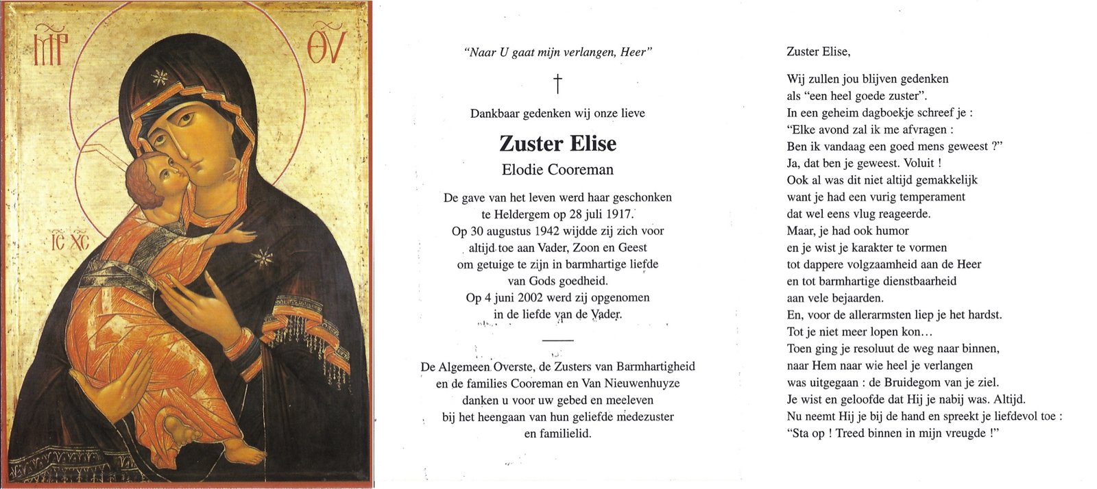 | Cooreman Elodie, Zuster Elise | Heldergem | 28/07/1917 | Heldergem | 04/06/2002 |