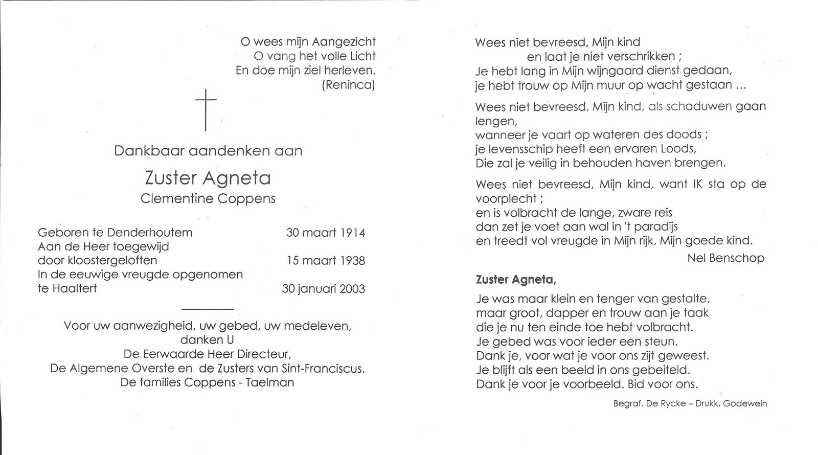 | Coppens Clementine, Zuster Agneta | Denderhoutem | 30/03/1914 | Haaltert | 30/01/2003 |