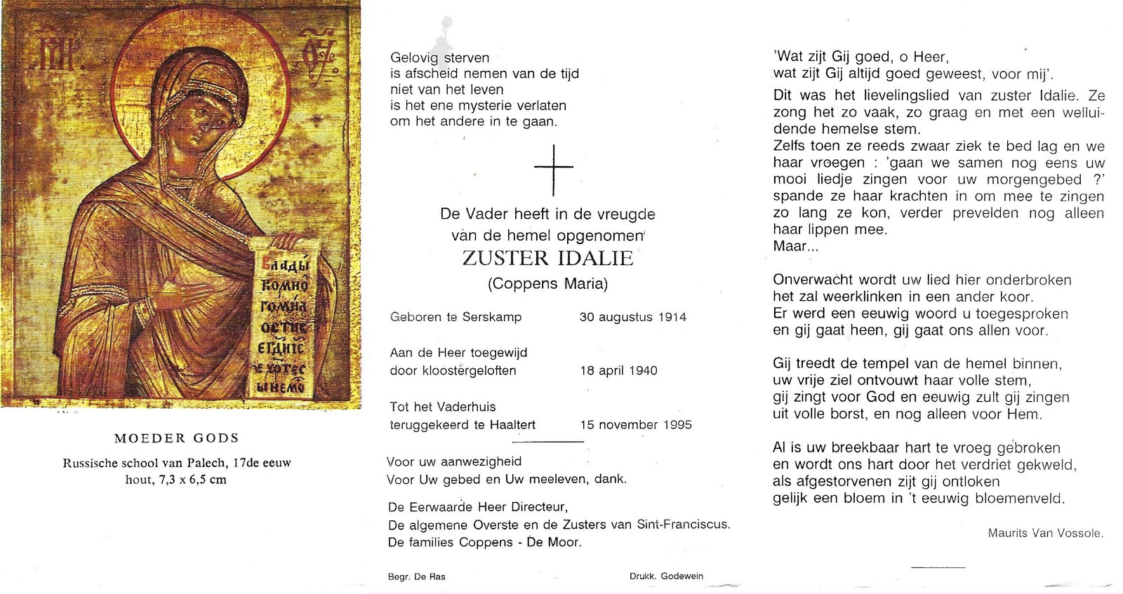 | Van Der Schueren Maria-Irèna, Zuster Aldegonde | Idegem | 29/04/1915 | Haaltert | 22/07/1999 |