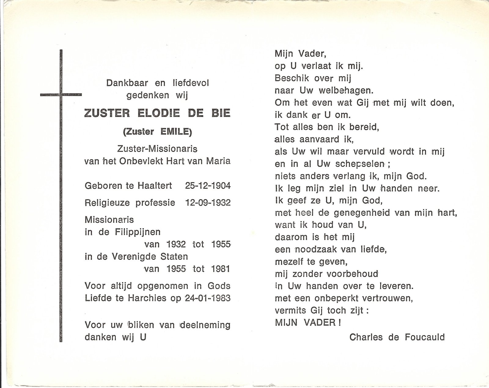 | De Bie Elodie, Zuster-Missionaris Emile | Haaltert | 25/12/1904 | Harchies | 24/01/1983 |