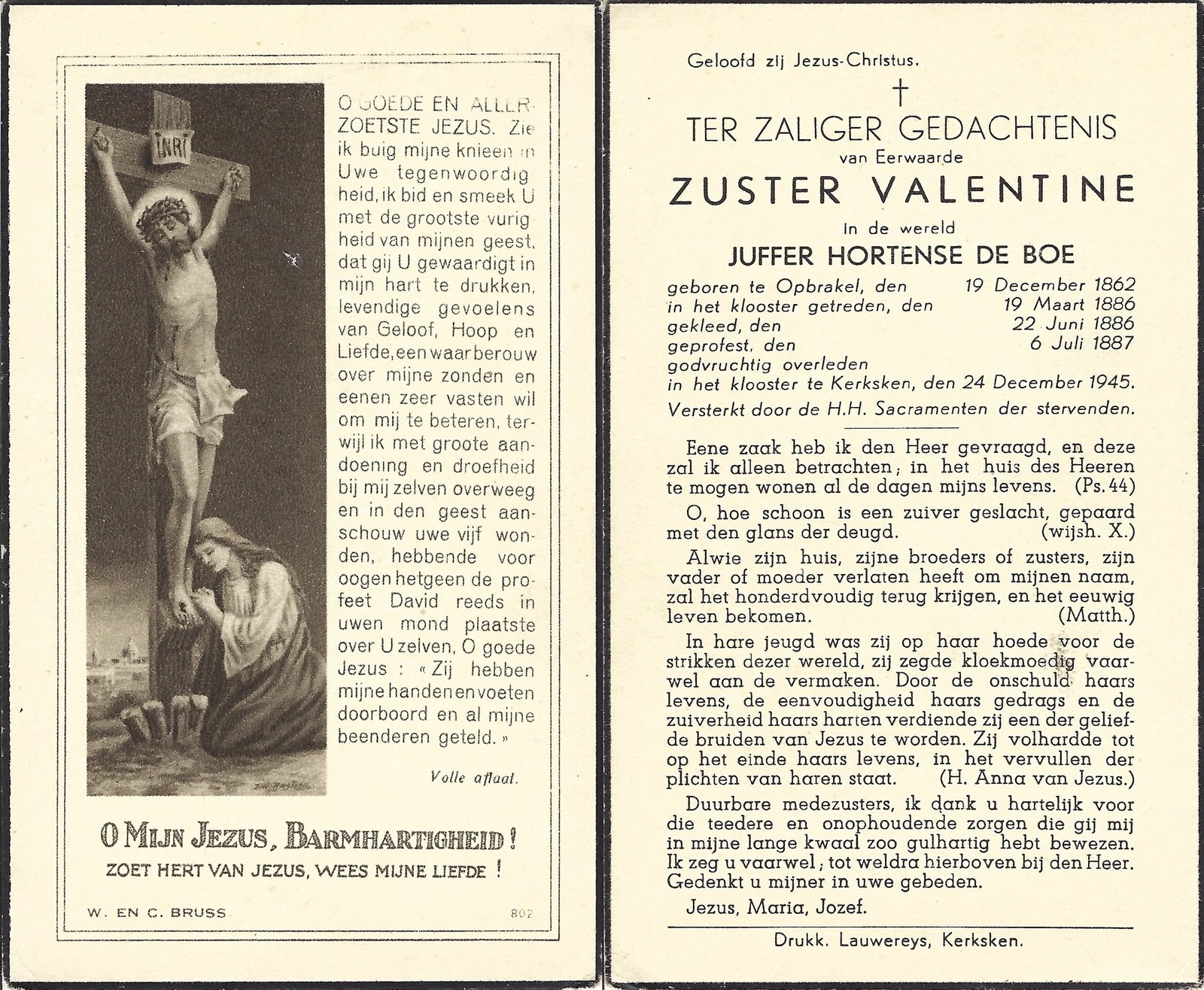 | De Boe Hortense, Zuster Valentine | Opbrakel | 19/12/1862 | Kerksken | 24/12/1945 |