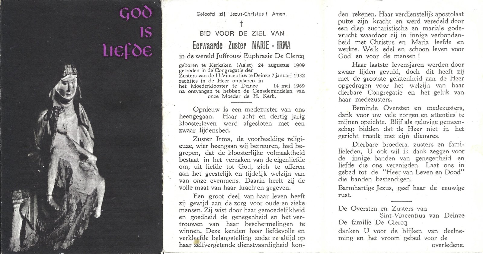| De Clercq Euphrasie, Zuster Marie-Irma | Kerksken | 24/08/1909 | Deinze | 14/05/1969 |