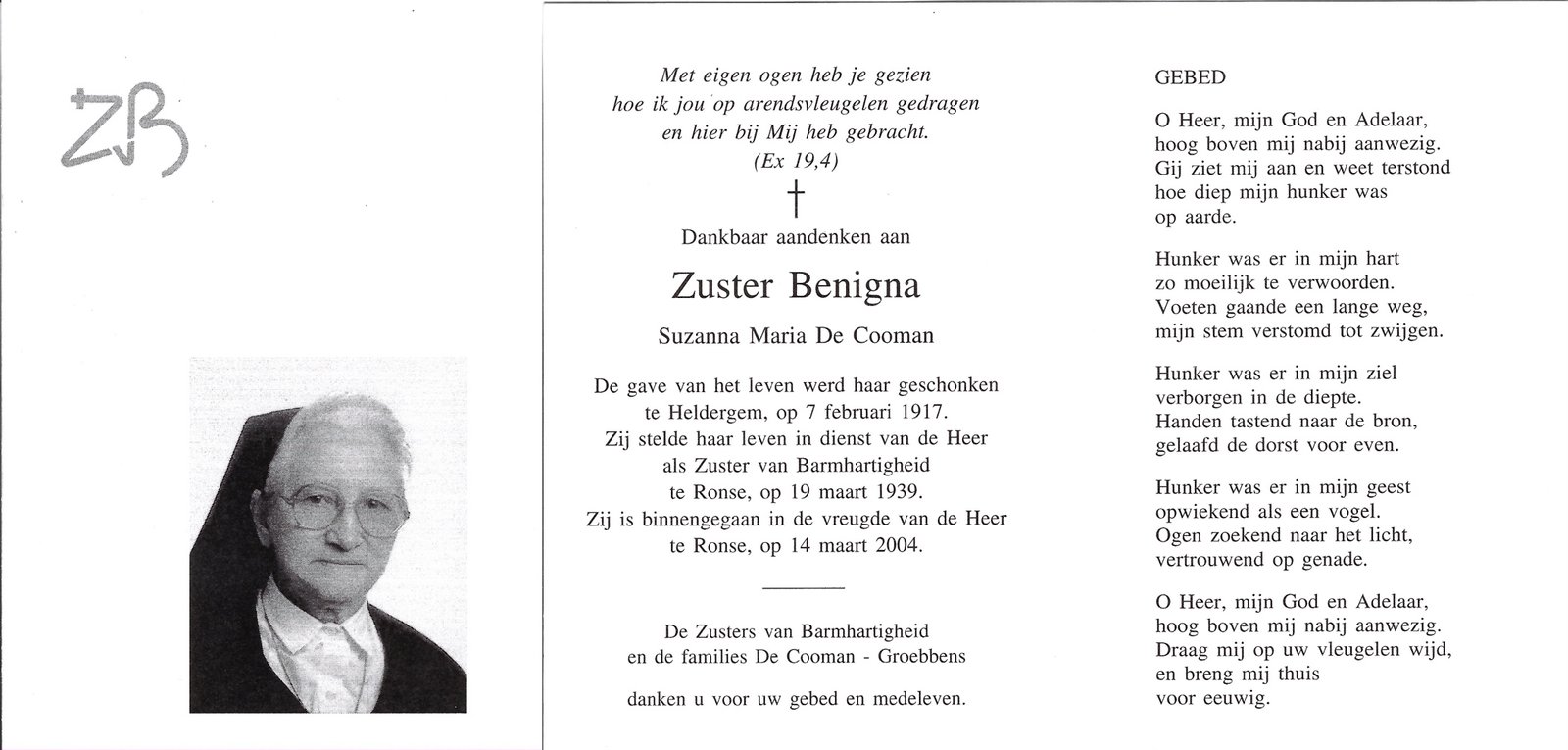 | De Cooman Suzanna, Zuster Benigna | Heldergem | 07/02/1917 | Ronse | 14/03/2004 |