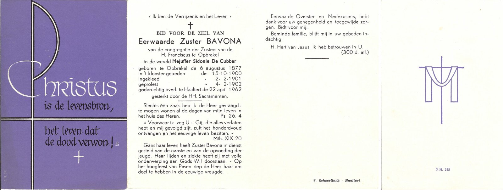 | De Cubber Sidonie, Zuster Bavona | Opbrakel | 06/08/1877 | Haaltert | 22/04/1962 |