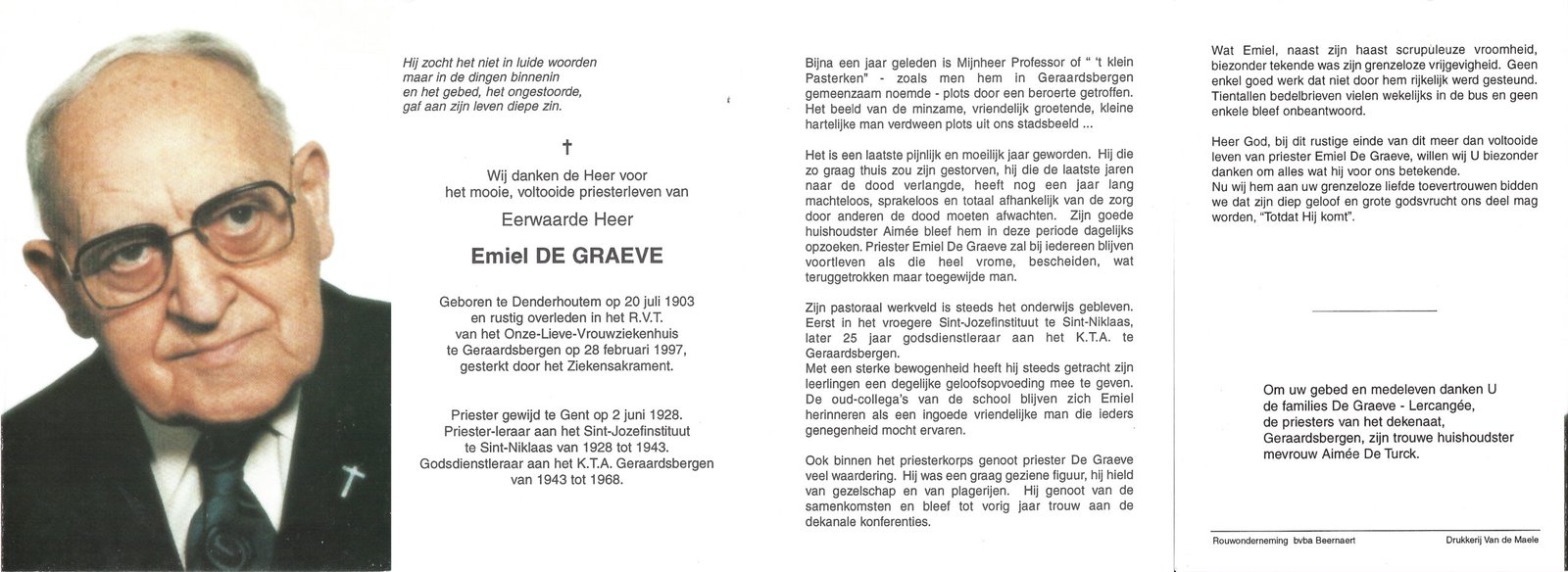 | De Graeve Emiel, Priester | Denderhoutem | 20/07/1903 | Geraardsbergen | 28/02/1997 |