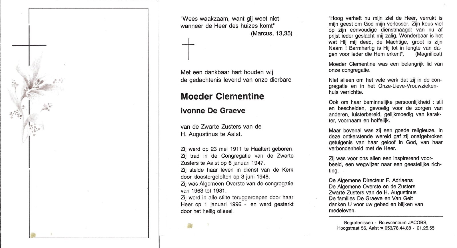 | De Graeve Ivonne, Moeder Clementine | Haaltert | 23/05/1911 | Aalst | 01/01/1996 |