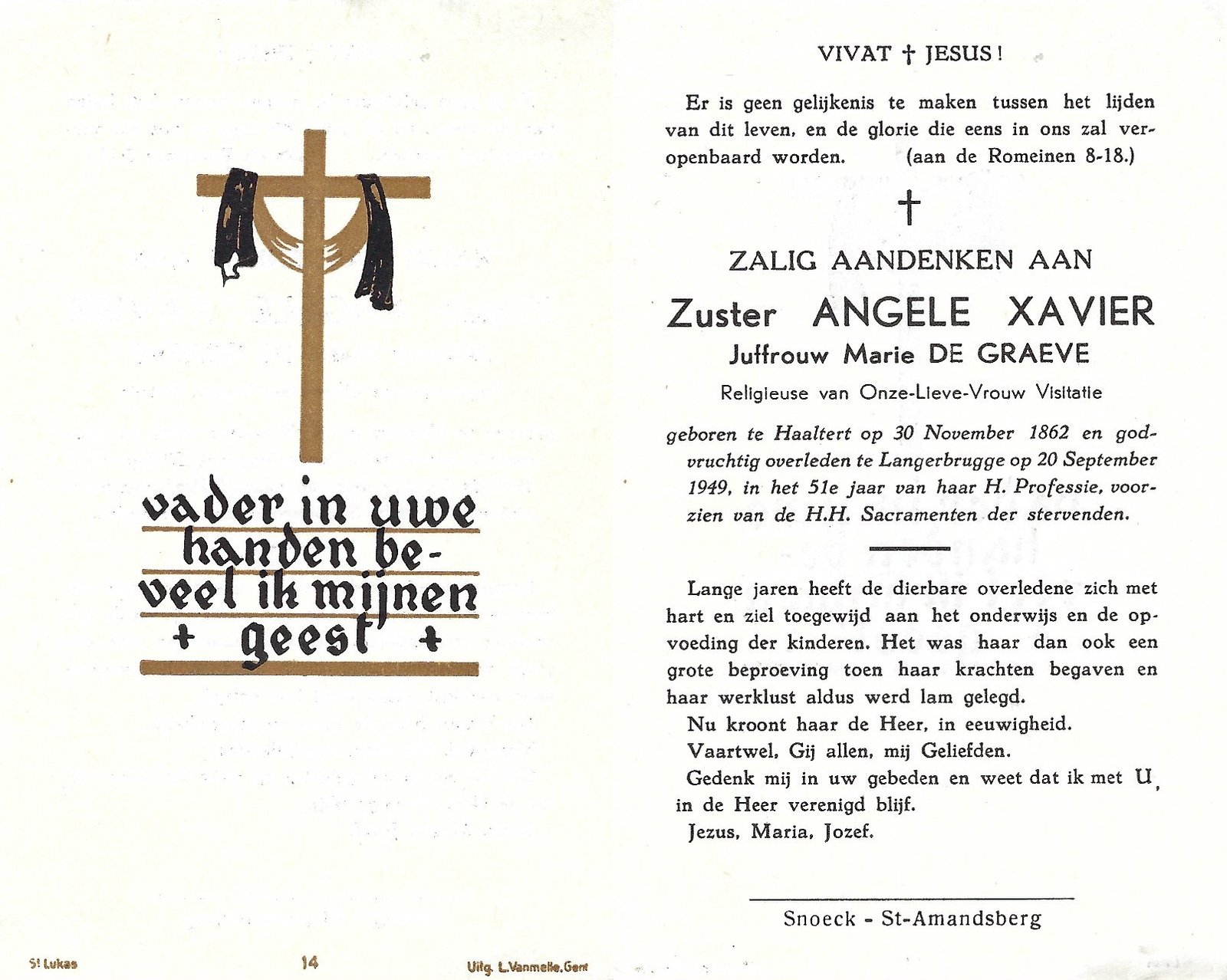 | De Graeve Marie, Zuster Angèle Xavier | Haaltert | 30/11/1862 | Langerbrugge | 20/09/1949 |