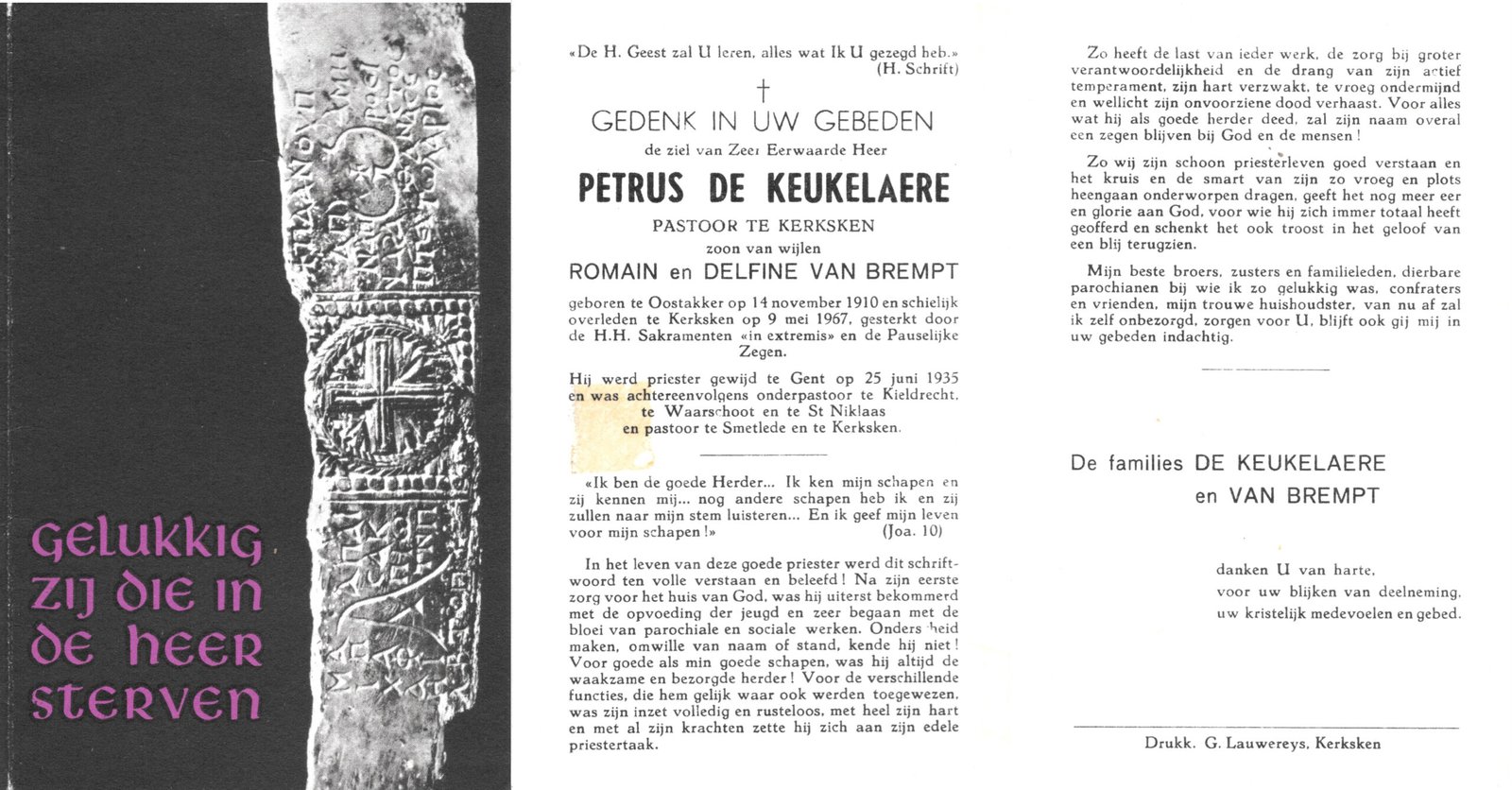 | De Keukelaere Petrus, Pastoor Kerksken | Oostakker | 14/11/1910 | Kerksken | 09/05/1976 |
