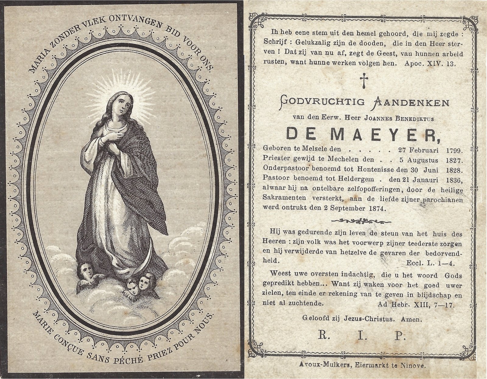 | De Maeyer Joannes, Priester Heldergem | Melsele | 27/02/1799 | Heldergem | 02/09/1874 |