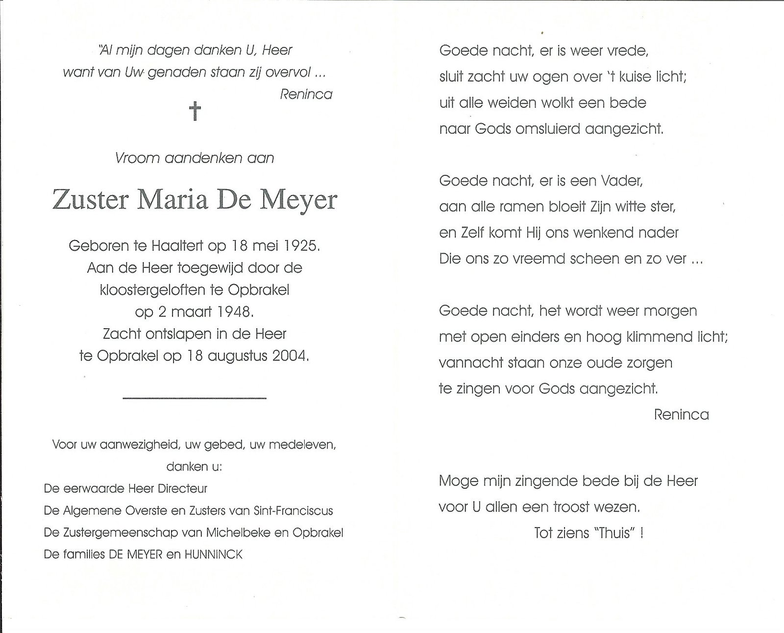 | De Meyer Maria, Zuster Maria | Haaltert | 18/05/1925 | Opbrakel | 18/08/2004 |