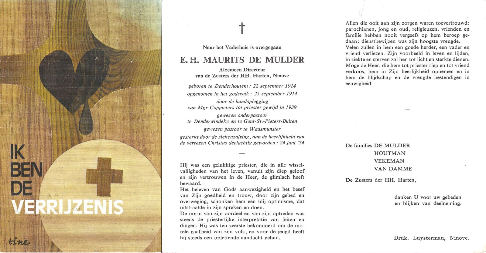 | De Mulder Maurits, Priester | Denderhoutem | 22/09/1914 | Waasmunster | 24/07/1974 |