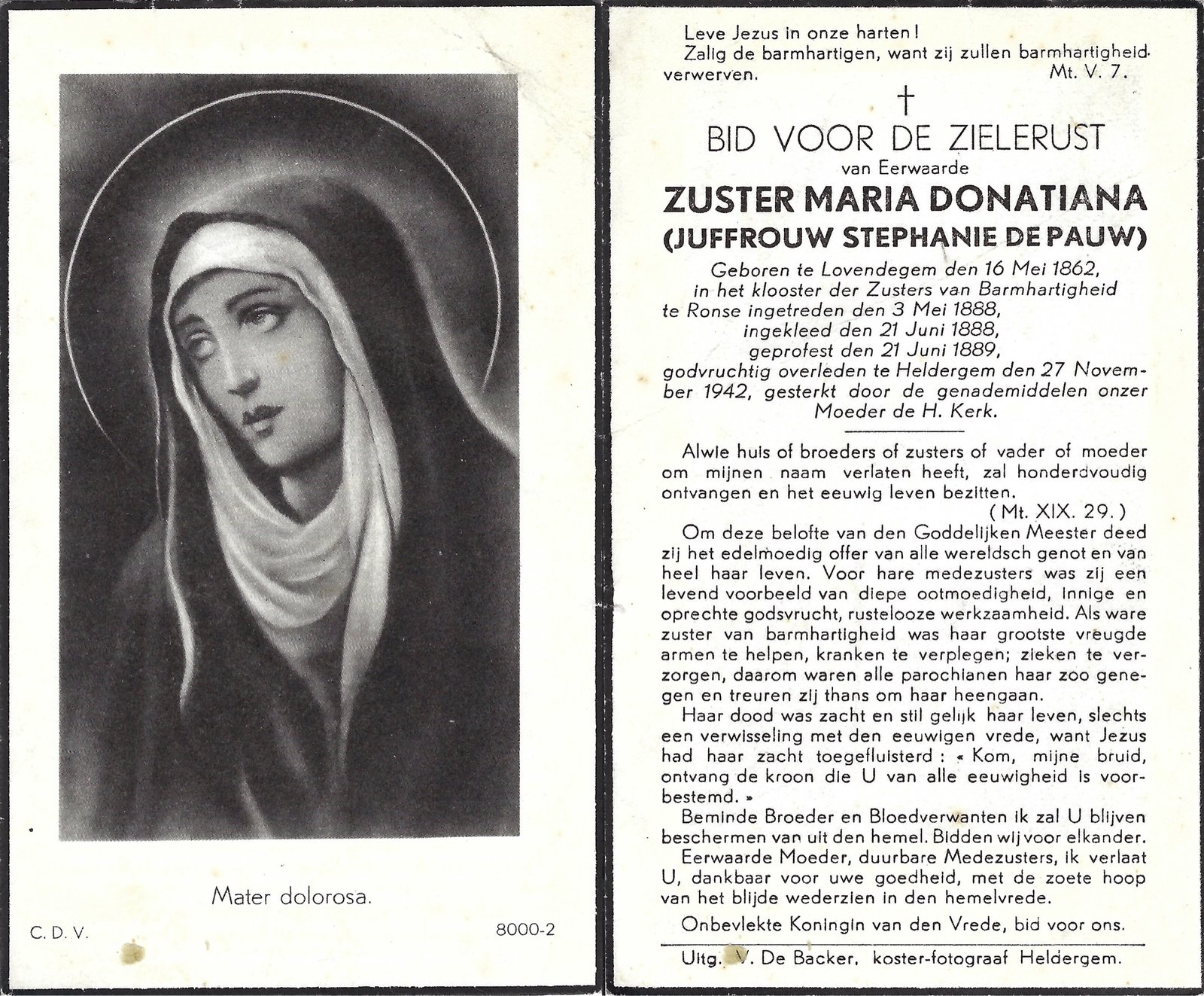 | De Pauw Stephanie, Zuster Donatiana | Lovendegem | 16/05/1862 | Heldergem | 27/11/1942 |