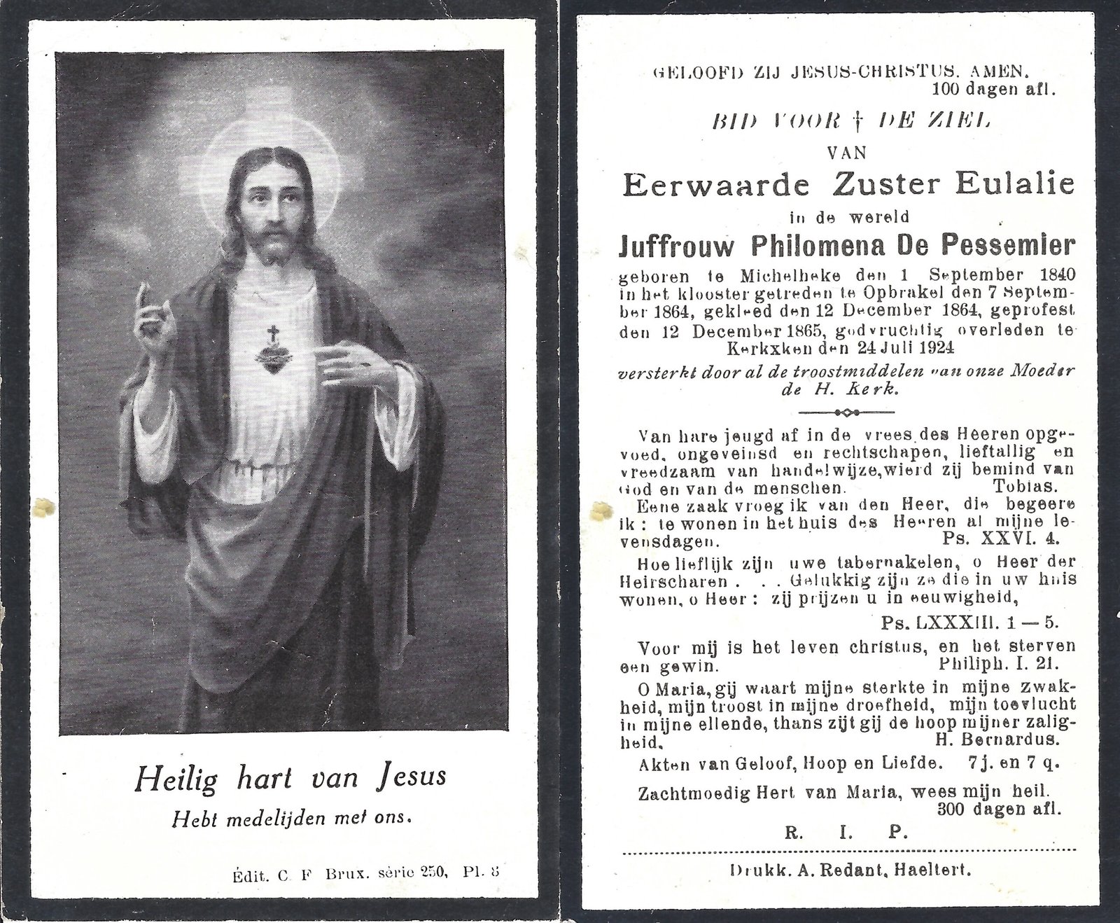 | De Pessemier Philomena, Zuster Eulalie | Michelbeke | 01/09/1840 | Kerksken | 24/07/1924 |
