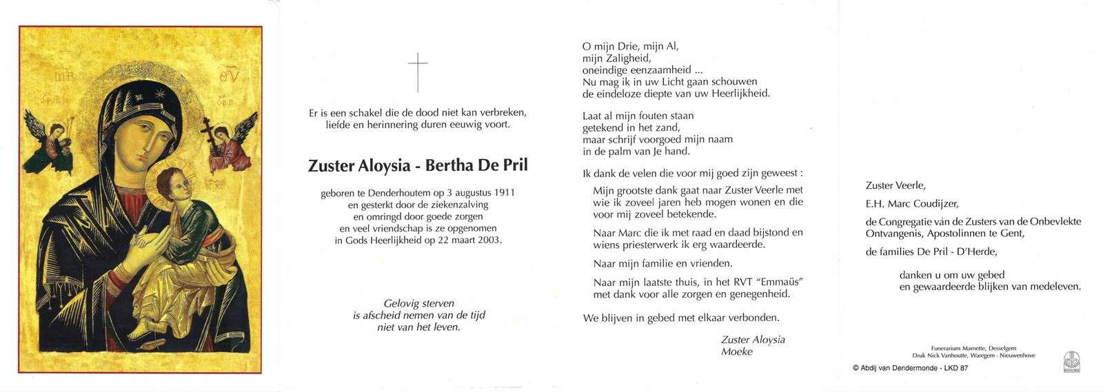 | De Pril Bertha, Zuster Aloysia | Denderhoutem | 03/08/1911 | Denderhoutem | 22/03/2003 |