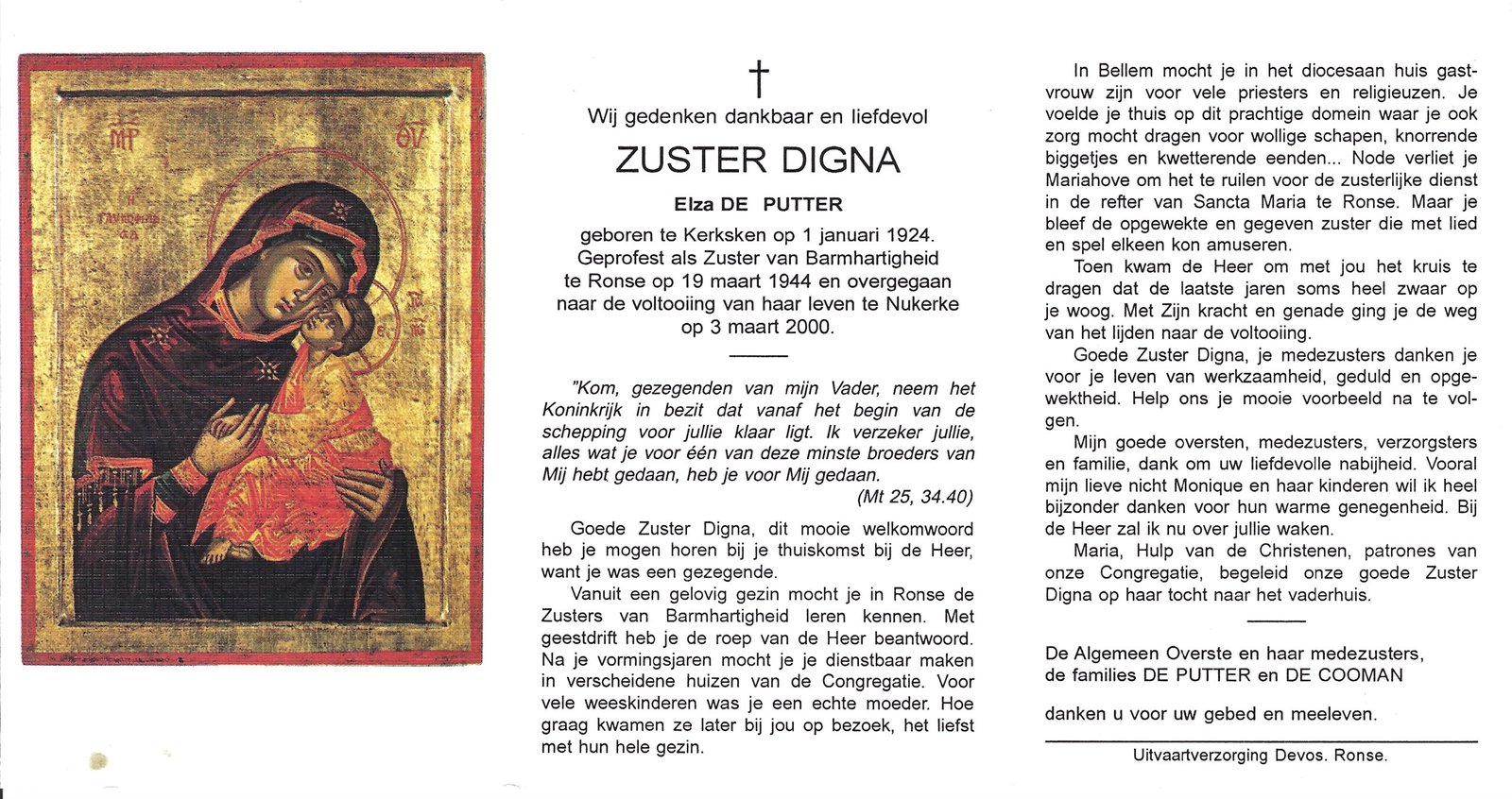 | De Putter Elza, Zuster Digna | Kerksken | 01/01/1924 | Nukerke | 03/03/2000 |