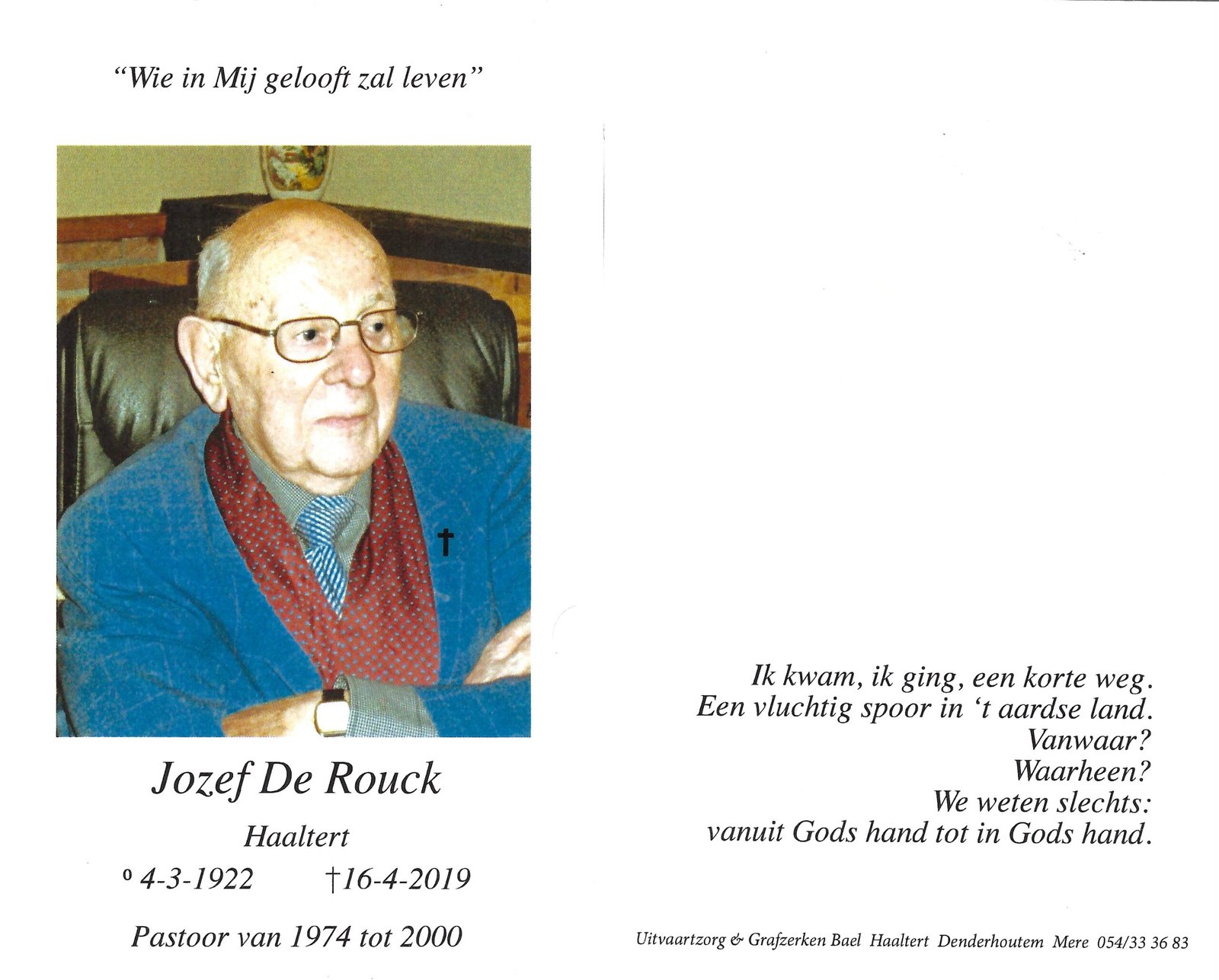 | De Rouck Jozef, Priester | Haaltert | 04/03/1922 | Haaltert | 16/04/2019 |