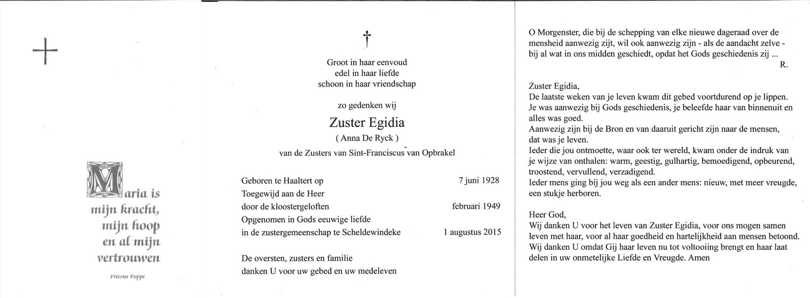 | De Ryck Anna, Zuster Egidia | Haaltert | 07/06/1928 | Scheldewindeke | 01/08/2015 |