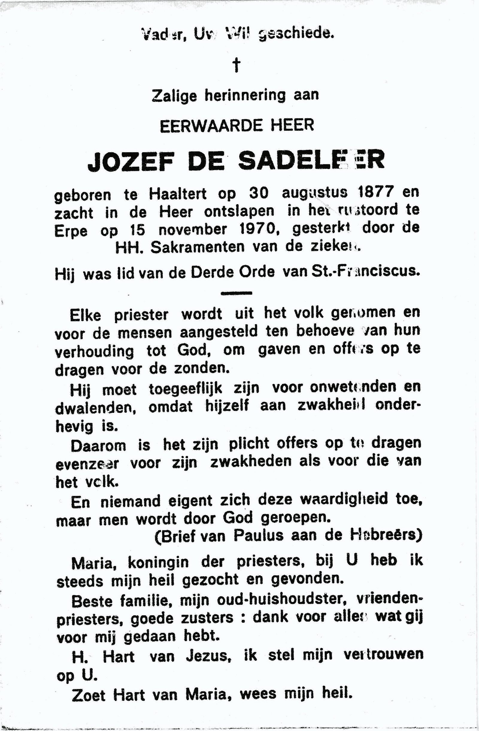 | De Sadeleer Jozef, Priester | Haaltert | 30/08/1877 | Erpe | 15/11/1970 |