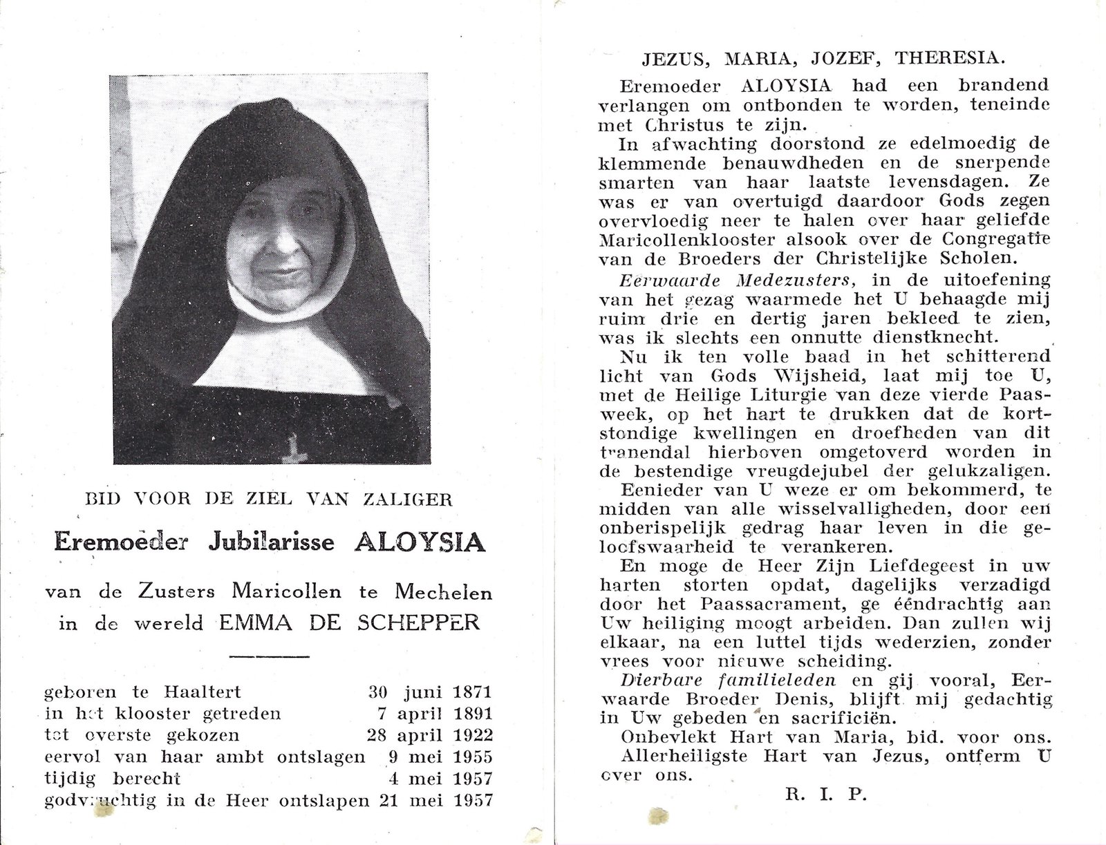 | De Schepper Emma, Moeder Aloysia | Haaltert | 30/06/1871 | Mechelen | 21/05/1957 |