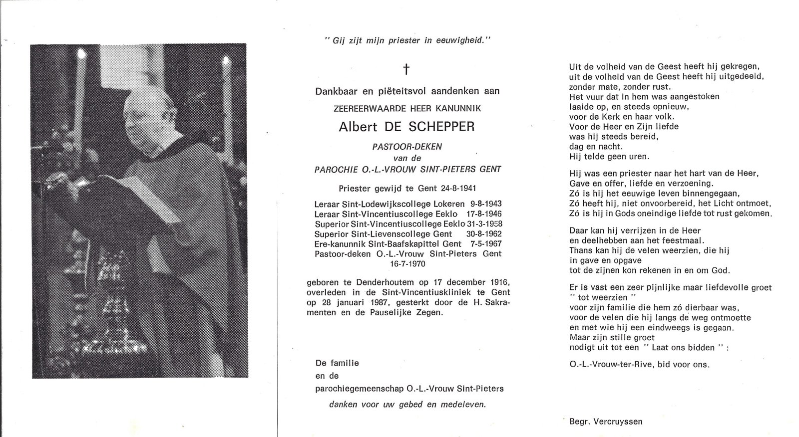 | De Schepper Albert, Kanunnik | Denderhoutem | 17/12/1916 | Gent | 28/01/1987 |