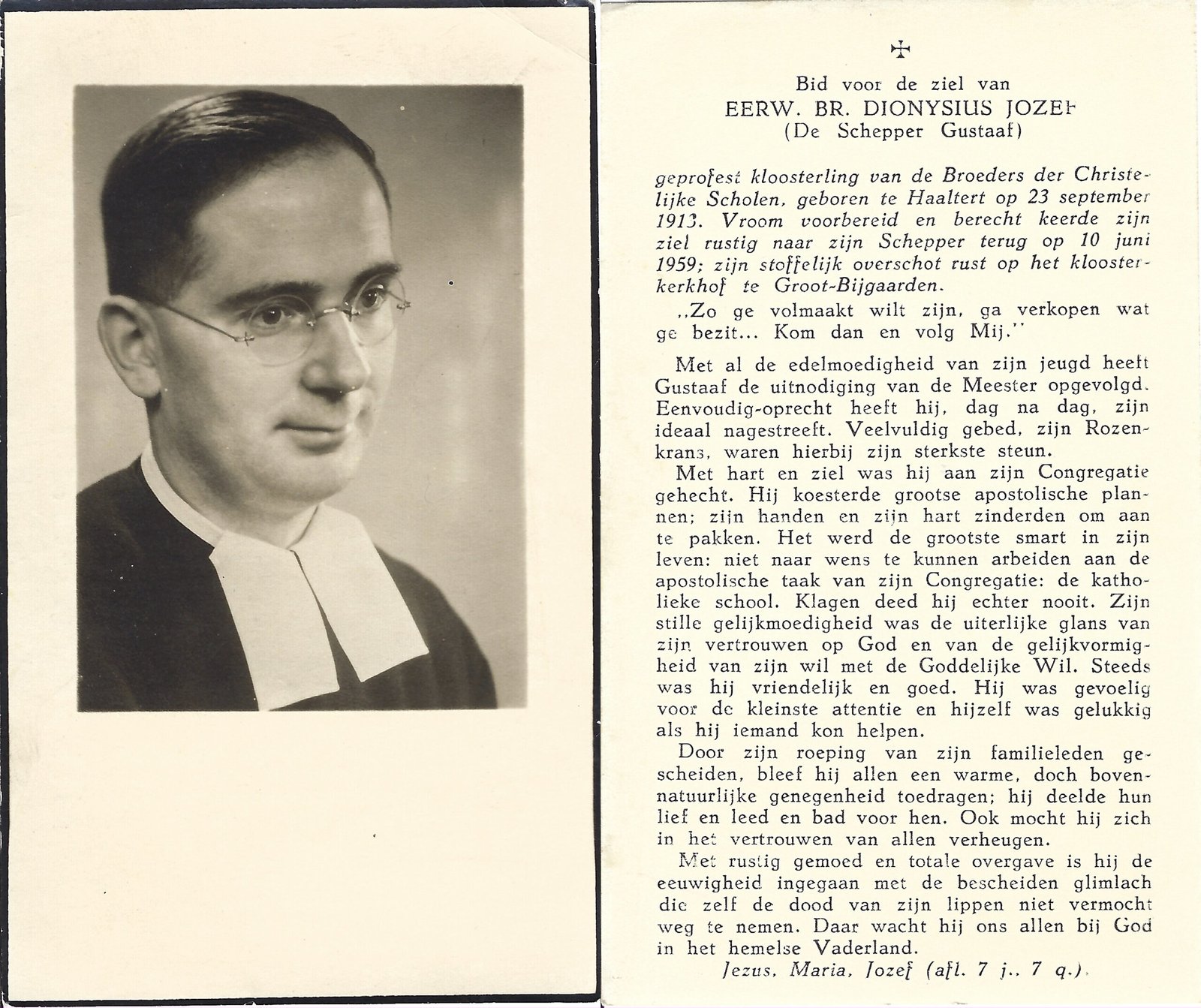 | De Schepper Gustaaf, Broeder Dyonisius | Haaltert | 23/09/1913 | Groot-Bijgaarden | 10/06/1959 |