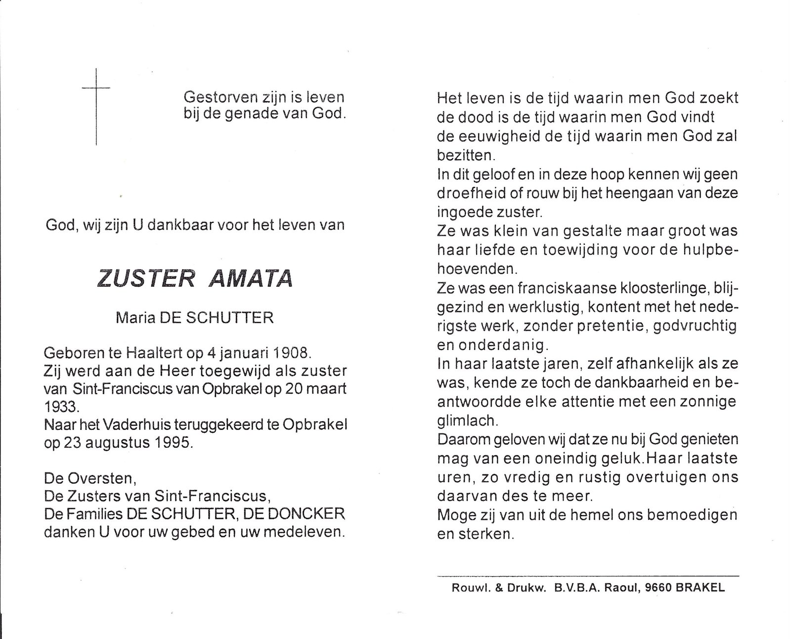 | De Schutter Maria, Zuster Amata | Haaltert | 04/01/1908 | Opbrakel | 23/08/1995 |