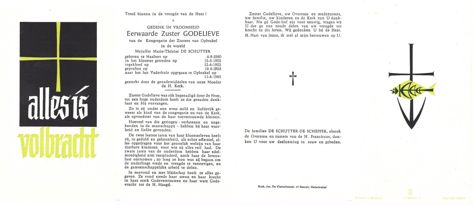| De Schutter Marie-Thérèse, Zuster Godelieve | Haaltert | 04/09/1880 | Opbrakel | 11/06/1965 |