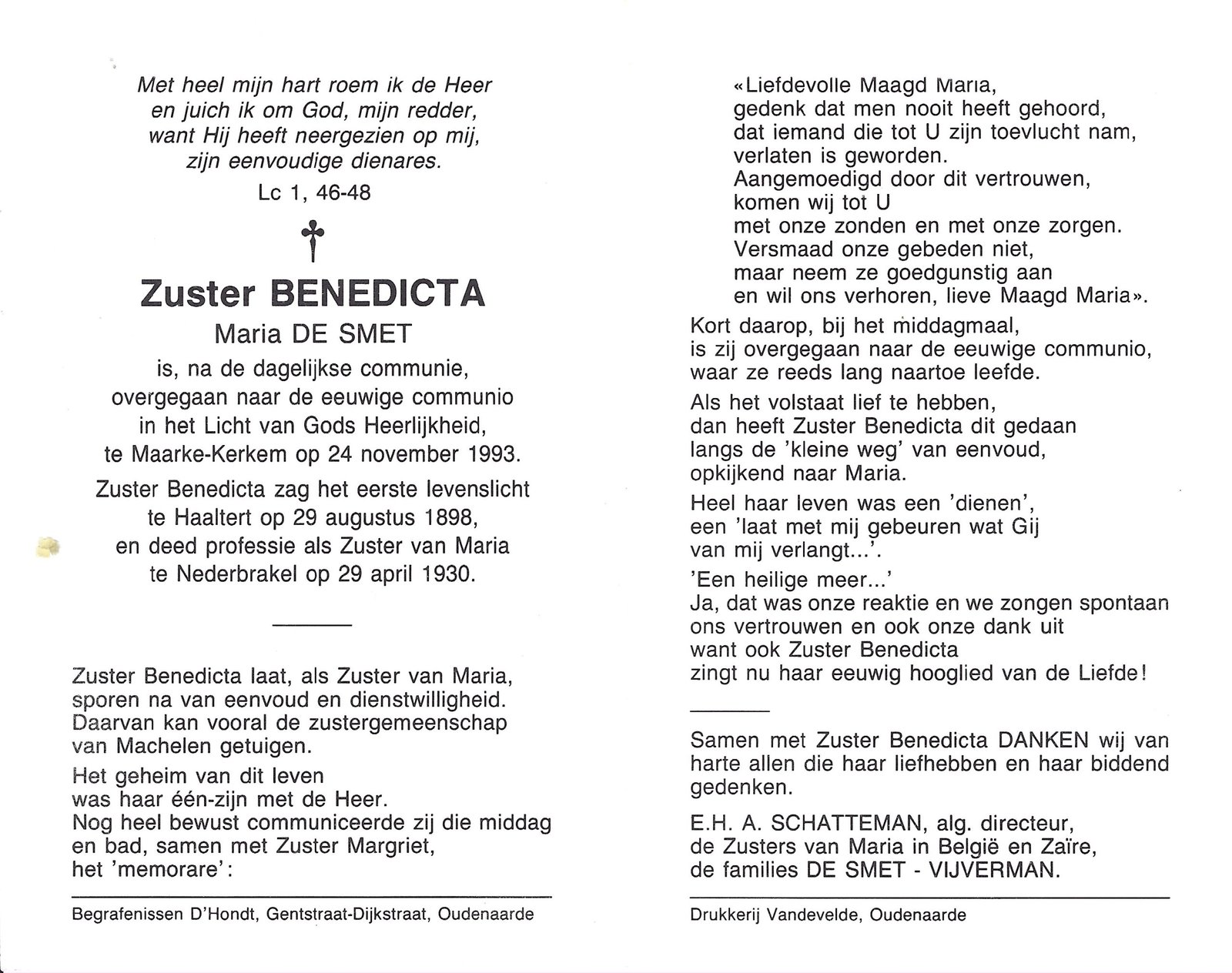 | De Smet Maria, Zuster Benedicta | Haaltert | 29/08/1898 | Maarke-Kerkem | 24/11/1993 |
