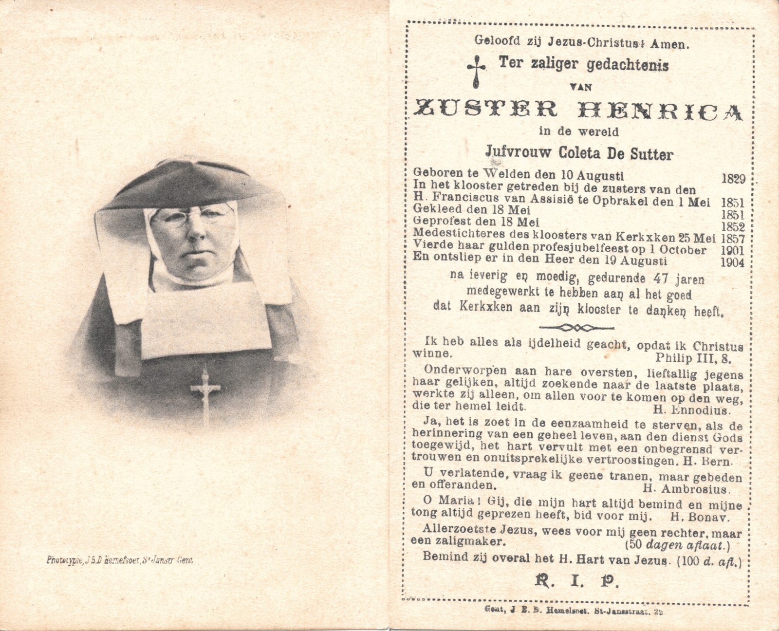 | De Sutter Coleta, Zuster Henrica | Welden | 10/08/1829 | Kerksken | 19/08/1904 |