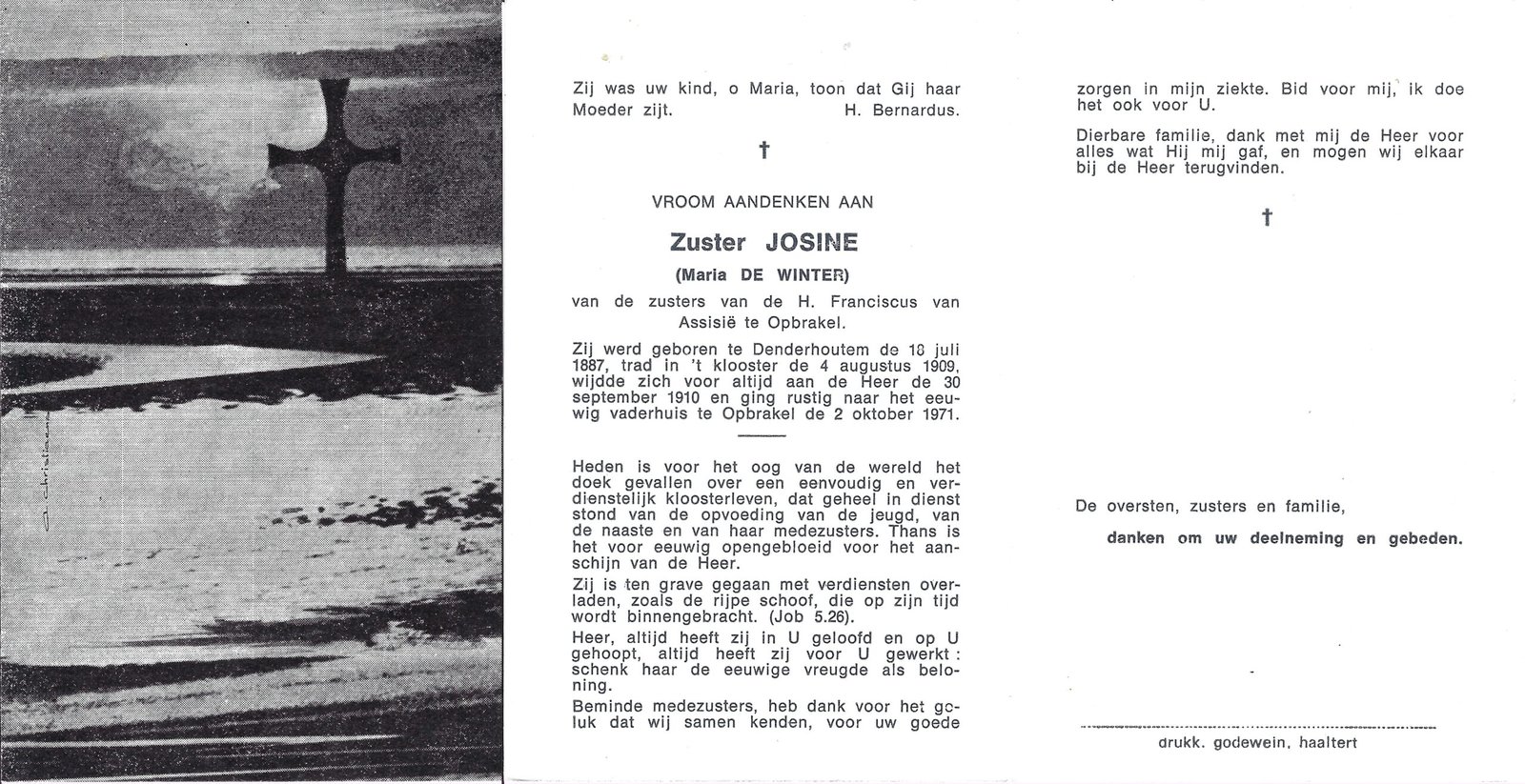| De Winter Maria, Zuster Josine | Denderhoutem | 18/07/1887 | Opbrakel | 02/10/1971 |