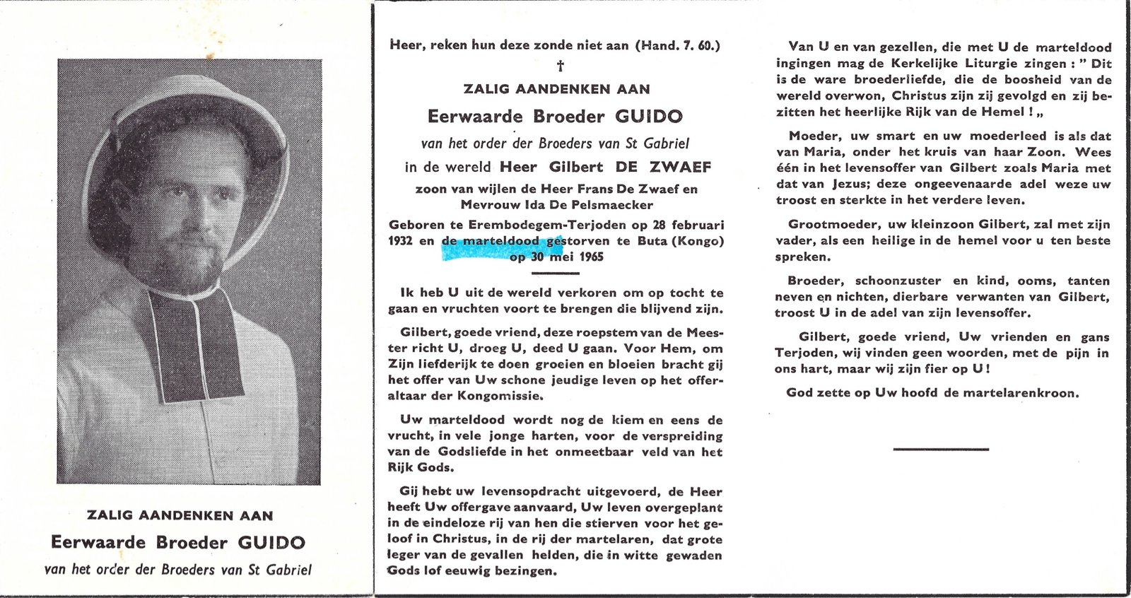 | De Zwaef Gilbert, Broeder Guido | Terjoden | 28/02/1932 | Buta (Kongo) | 30/05/1965 |
