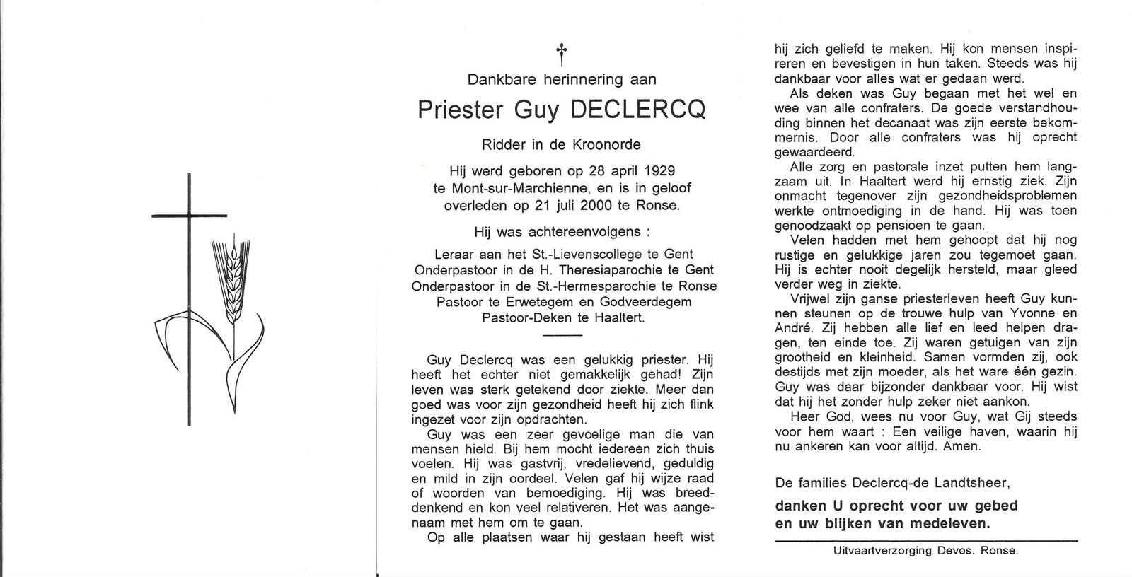| Declercq Guy, Priester-Deken Haaltert | Mont-sur-Marchienne | 28/04/1929 | Ronse | 21/07/2000 |