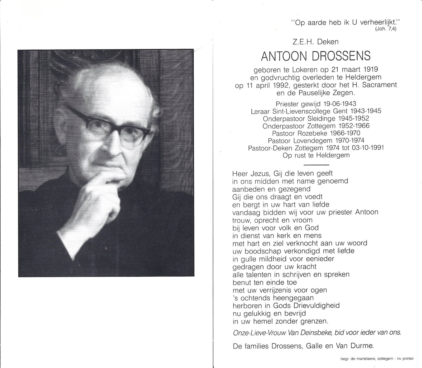 | Drossens Antoon, Priester | Lokeren | 21/03/1919 | Heldergem | 11/04/1992 |