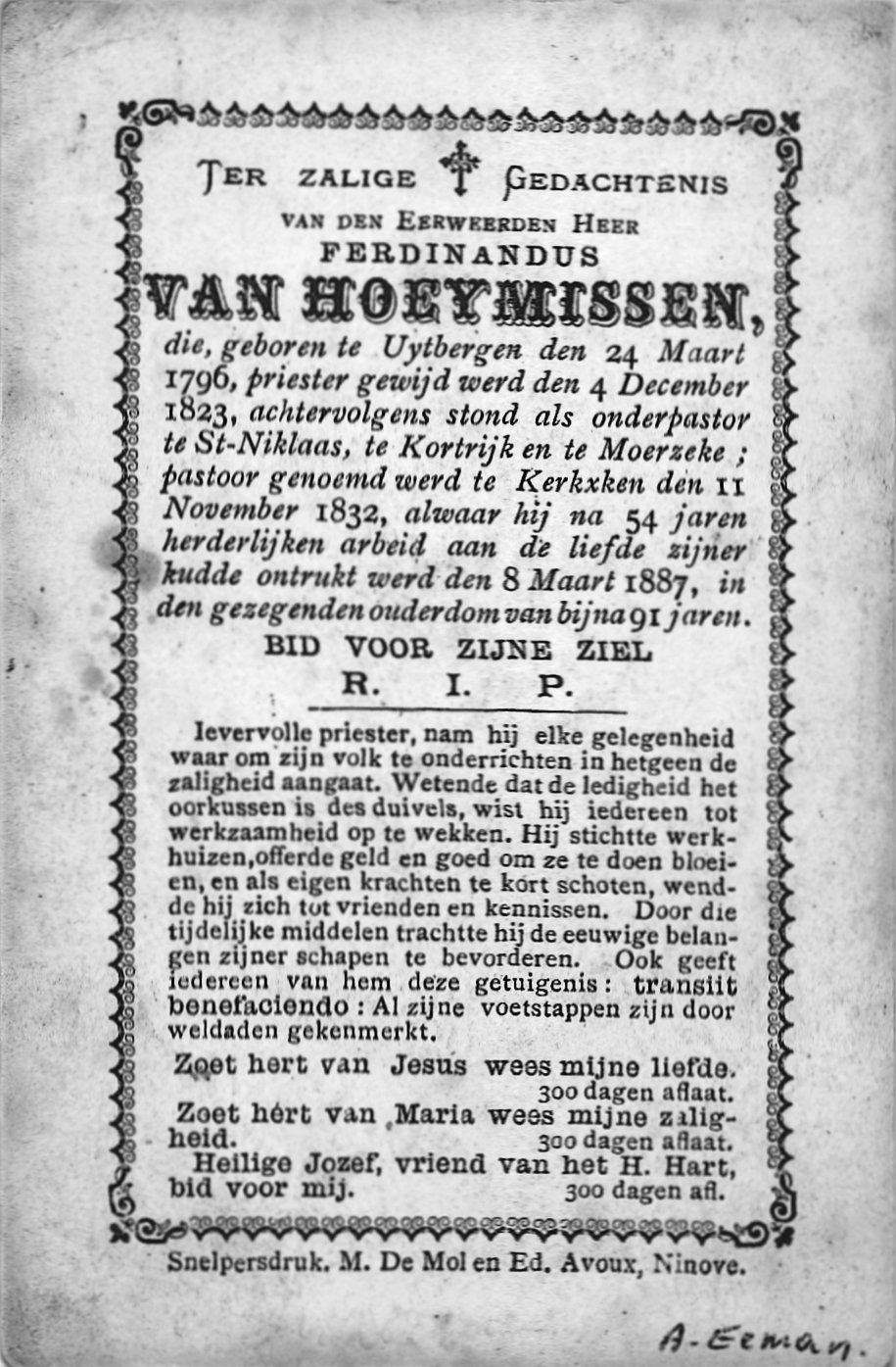 | Van Hoeymissen Ferdinandus, Priester Kerksken | Uitbergen | 24/03/1796 | Kerksken | 08/03/1887 |