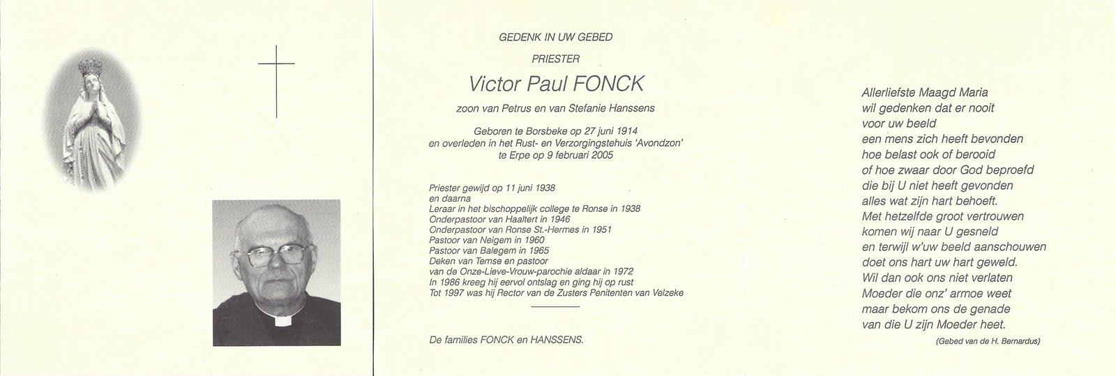 | Fonck Victor, Onderpastoor Haaltert | Borsbeke | 27/06/1914 | Erpe | 09/02/2005 |