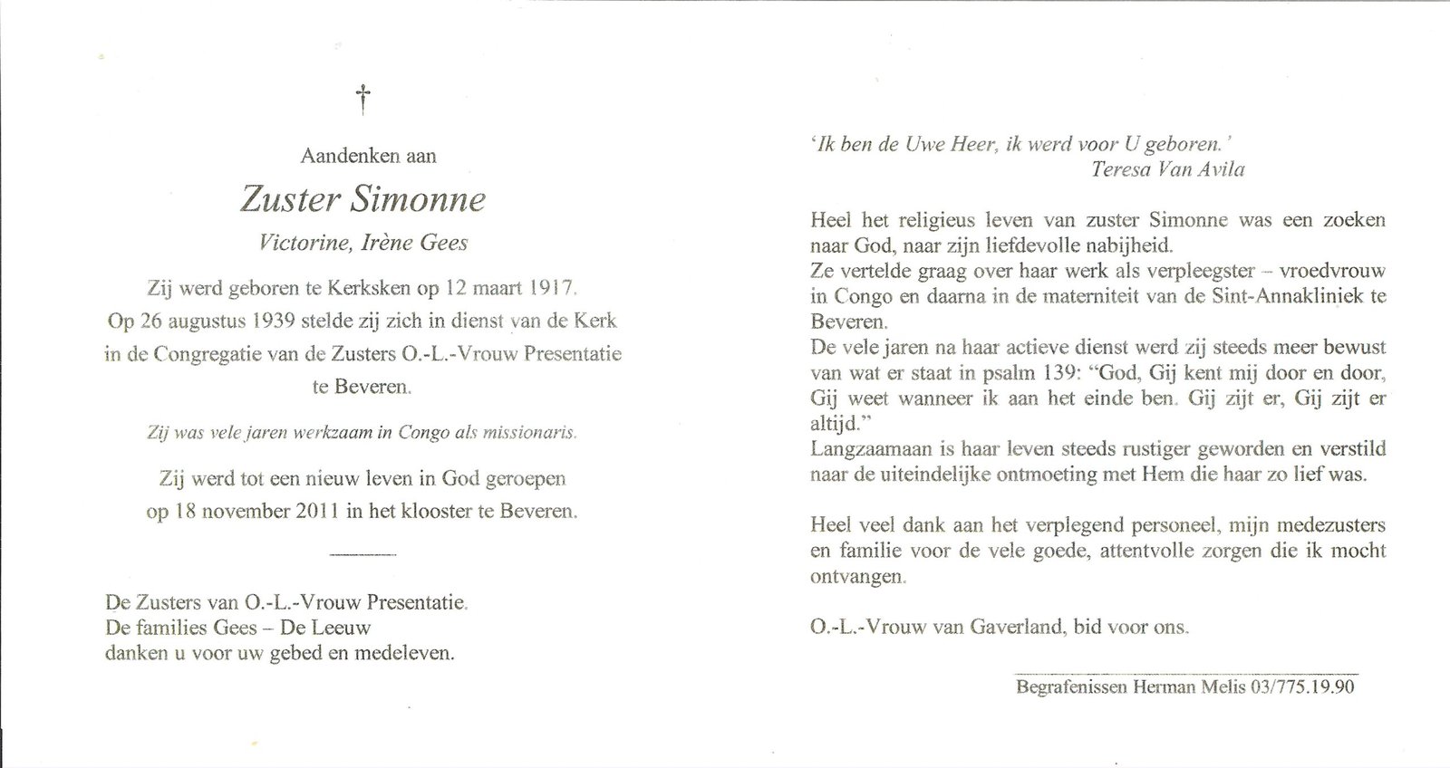 | Gees Victorine, Zuster Simonne | Kerksken | 12/03/1917 | Beveren | 18/11/2011 |