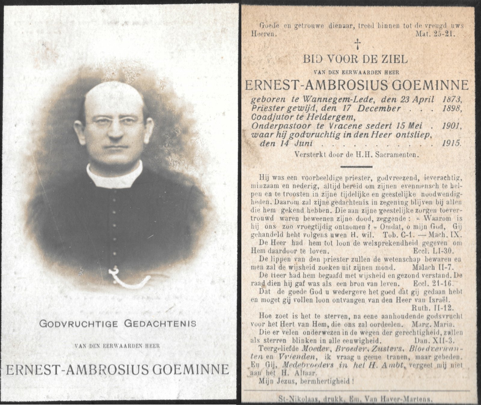 | Goeminne Ernest, Coadjutor Heldergem | Wannegem | 23/04/1873 | Vrasene | 14/06/1915 |