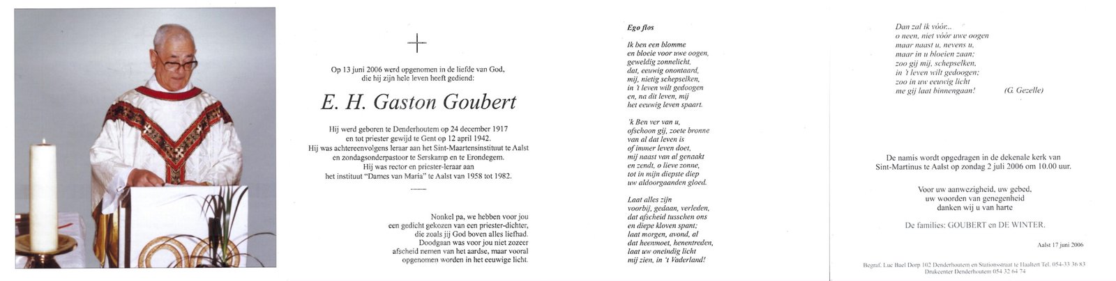 | Goubert Gaston, Priester | Denderhoutem | 24/12/1917 | Aalst | 13/06/2006 |