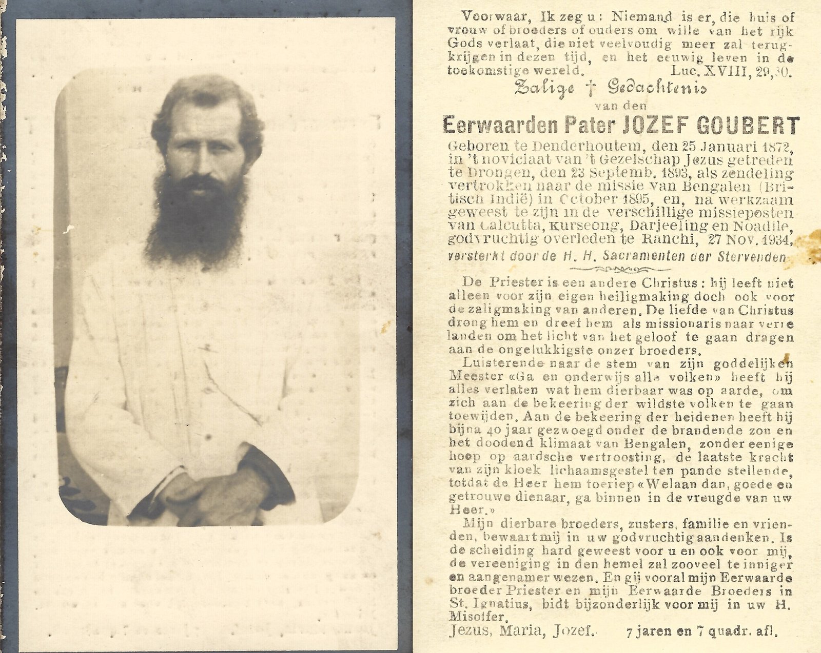 | Goubert Jozef, Pater | Denderhoutem | 25/01/1872 | Ranchi | 27/11/1934 |