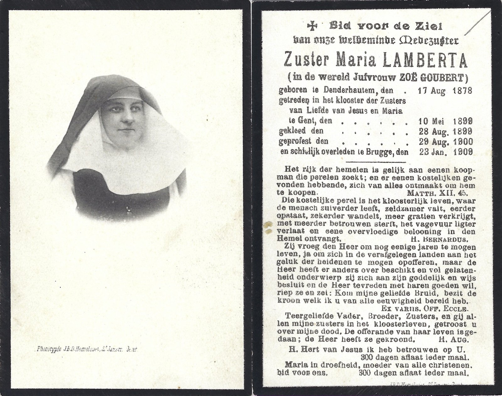 | Goubert Zoë, Zuster Maria Lamberta | Denderhoutem | 17/08/1878 | Brugge | 23/01/1909 |