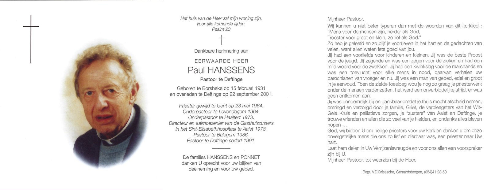 | Hanssens Paul, Onderpastoor Haaltert | Borsbeke | 15/02/1931 | Deftinge | 22/09/2001 |